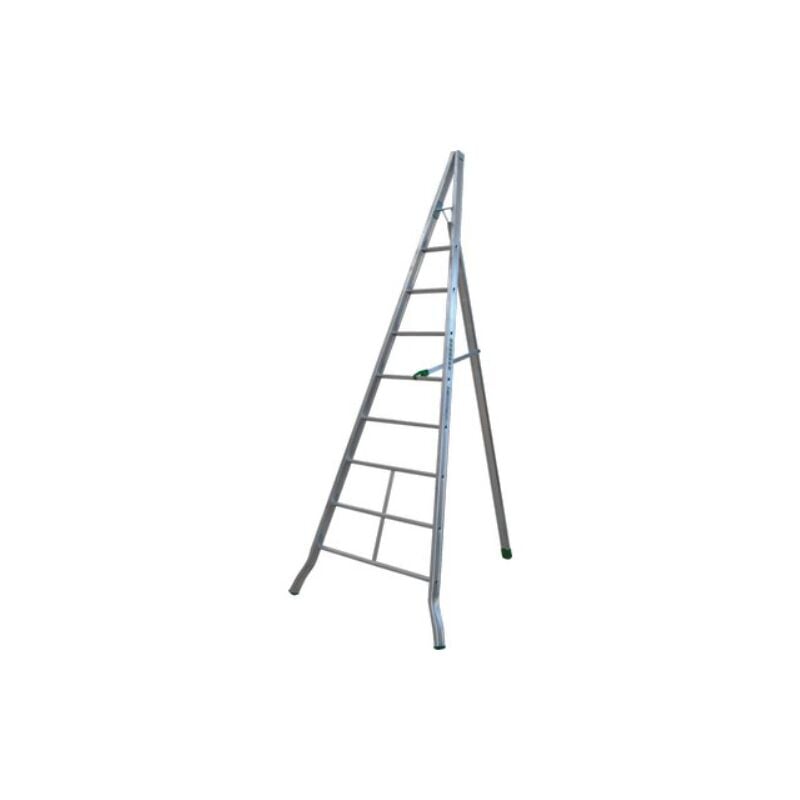 Scala triangolare agri facal Alluminio h.cm 300 pioli 8 in alluminio con montanti convergenti. testata e certificata secondo il d.lgs.81/2008. portata kg. 100. gradini a trapezio inclinato, ribordati e saldati per la massima sicurezza strutturale. montanti tubolari nervati mm. 30x65. piede snodo ovale gommato con anima d'acciaio ed anti affondamento (ampie dimensioni cm. 16x11). corda di sicurezza antiapertura in materiale ad alta tenuta.