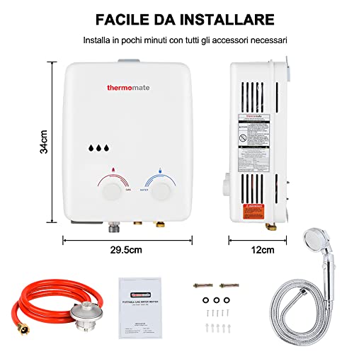 【FACILITÀ DI INSTALLAZIONE E UTILIZZO FRIENDLY 】- Con un design compatto e leggero, lo scaldacqua portatile Thermomate richiede pochissimo spazio per l'installazione, il che è più adatto per le aree esterne e per scopi ricreativi. Questo modello viene fornito con tutti gli accessori necessari per facilitare l'installazione senza problemi. La doccia a gas è alimentata da 2 batterie di tipo "D", che è ottimo per la rete o altre aree in cui l'elettricità non è disponibile.