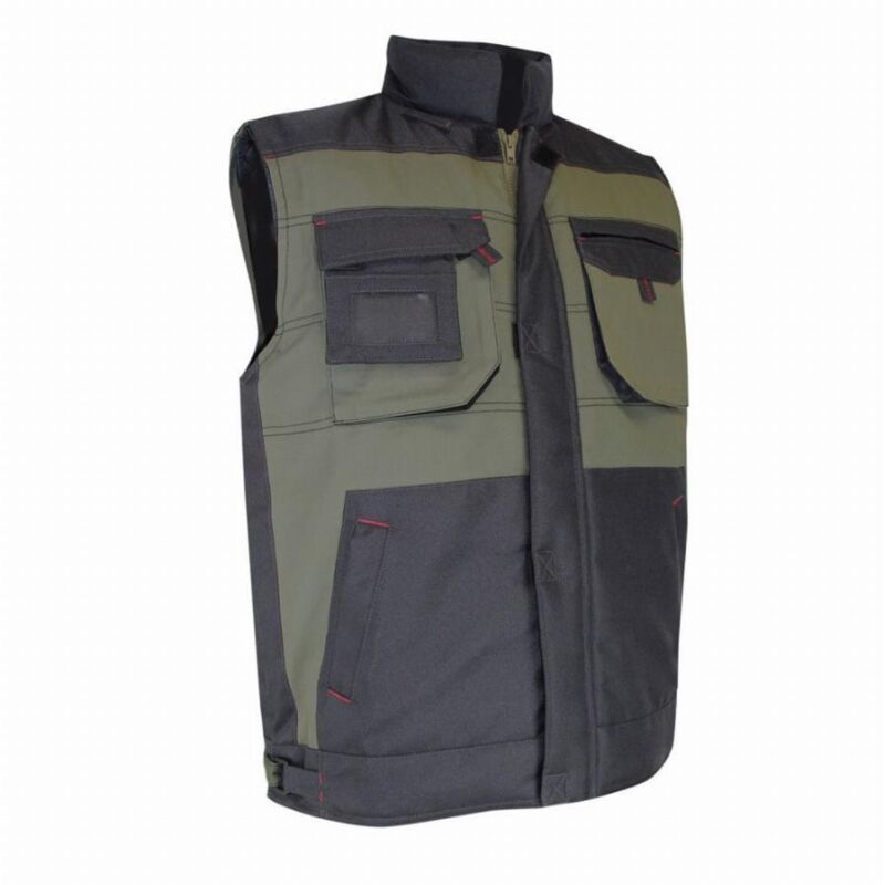 Caratteristiche: Collo alto Giromanica elasticizzato Davanti: cerniera nascosta 1 tasca pettorale sinistra con zip a soffietto 1 tasca pettorale destra con patta chiusa da velcro + porta badge a scomparsa + apertura per kit vivavoce 1 tasca interna sul petto 2 tasche inferiori poggiamani Dorso lungo Colore: Kaki / grigio notte Materiali: 60% cotone - 40% poliestere 300 g/m² Inserti Oxford 900D Imbottitura 100% poliestere 250 g/m²