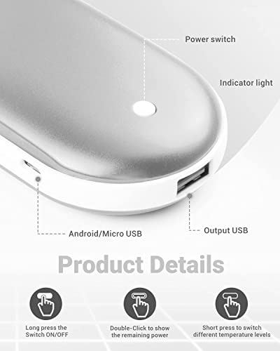 5200 mAh Scaldamani ad alta capacità e power bank 2 in 1: con una batteria ricaricabile da 10.000 mAh e ad alta capacità, lo scaldamani elettrico richiede solo 3-4,5 ore per essere completamente ricaricato. Può anche fornire 2-3 ricariche per smartphone o altri dispositivi, è una batteria di backup perfetta. Più piccolo e portatile rispetto ai normali power bank, ideale per attività all'aperto a lungo termine come jogging, pesca, campeggio, caccia, sci, arrampicata ed escursioni.