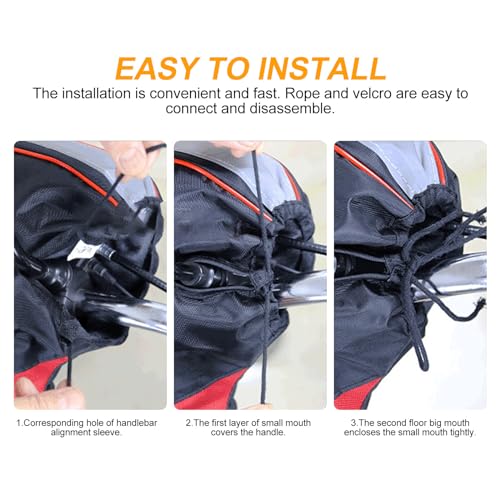 【Facile da installare e rimuovere】 Il coprimanubrio ha ampio spazio, può avvolgere l'intero manubrio ed è facile da montare.Devi solo metterlo sul manubrio, quindi utilizzare la corda incorporata per legare il manubrio o il retrovisore specchio attorno al coprimanubrio da fissare.