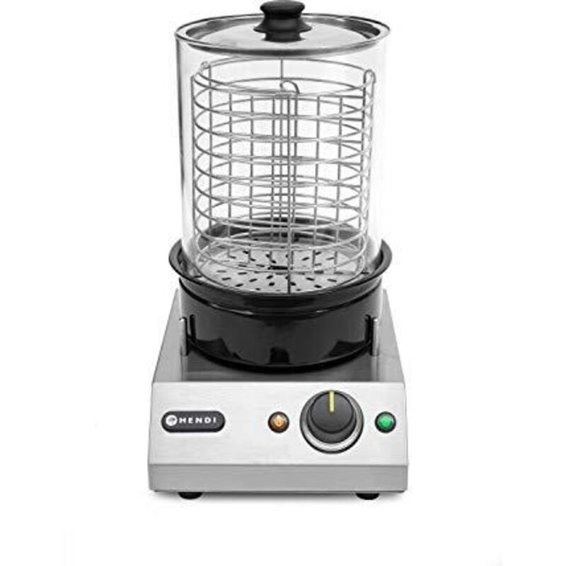 Dispositivo per riscaldare hot dog con regolazione della potenza. Alloggiamento in acciaio inossidabile INFORMAZIONI AGGIUNTIVE paralume in vetro: fi 200, H 245 mm cestello: fi 165, H 200 mm lunghezza massima della salsiccia: ca. 230mm
