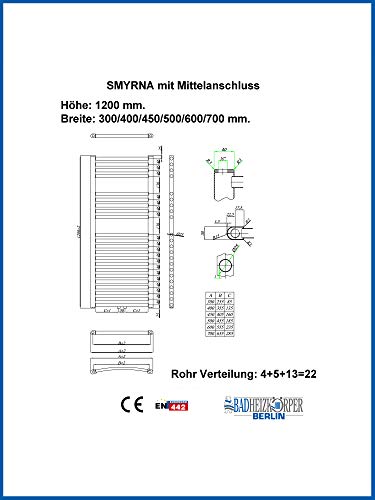 Scaldasalviette Radiatore SMYRNA bianco 300 x 1200 mm. medio collegamento
