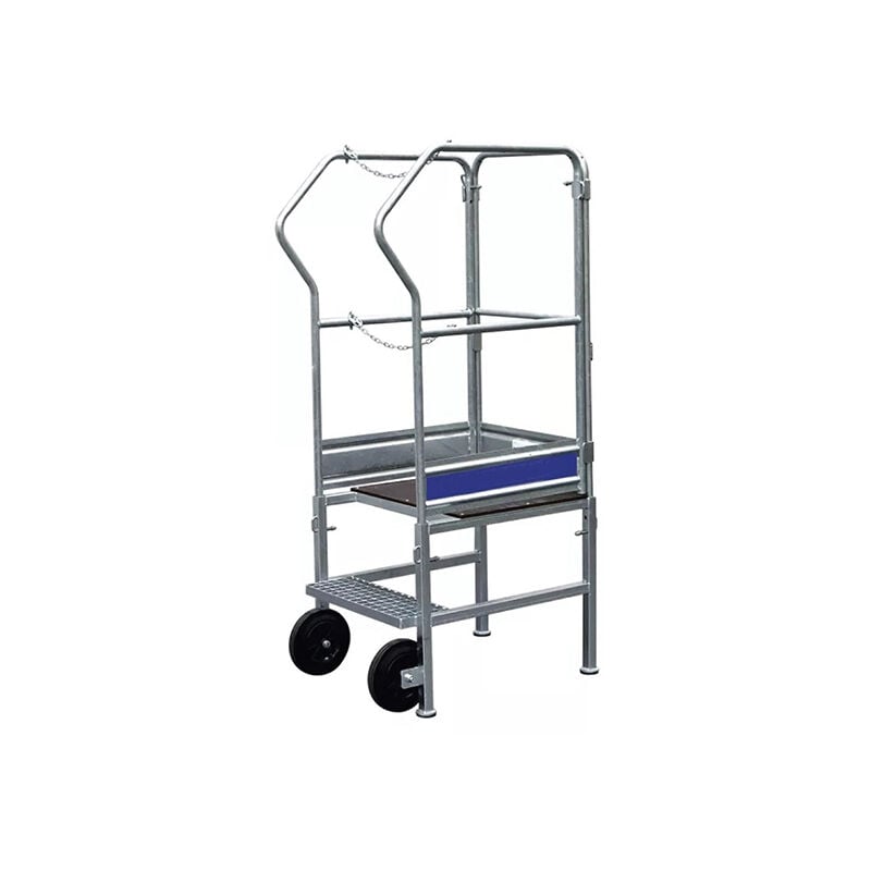USO - Lavoro di basso livello - Lavori di finitura o controlli rapidi - Manutenzione o cura: esecuzione di lavori di finitura, tinteggiatura, intonacatura, sostituzione di lampadine, ecc. - Speciale per grandi opere e cantieri, PIRL in acciaio zincato per un utilizzo illimitato - Uso interno o esterno LAVORARE IN SICUREZZA - Parapetti e cinghie che impediscono all'operatore di cadere e di incorrere in incidenti sul lavoro - Battiscopa che impediscono al piede di cadere dalla piattaforma o all'attrezzo di cadere - Pavimento antiscivolo - Ampio gradino antiscivolo con profondità di 160mm - Questa attrezzatura consente di lavorare in altezza in totale sicurezza, in conformità con il codice del lavoro. ELEVATA MANOVRABILITÀ - Si muove senza fatica su e giù per le scale - Può essere utilizzato negli angoli - Passa attraverso porte di 0.63m e si infila in corridoi stretti - Facile da spostare - Autoportante con ruota d'appoggio di 200mm di diametro che non segna il pavimento - Supera gli