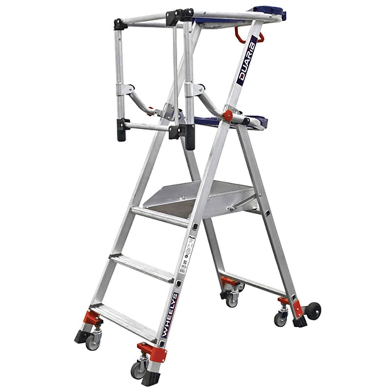 USO - Per i magazzini di logistica e stoccaggio, questa piattaforma passa facilmente tra i corridoi grazie alle 4 ruote pivottanti. - In ambienti industriali per la manutenzione o l'installazione di unità produttive. - Attrezzatura ideale per i verniciatori, con 2 ganci porta secchi e un ripiano porta fusti per ottimizzare lo spazio di lavoro. - In cantiere per elettricisti, stuccatori o termotecnici, lavora il più vicino possibile alla parete grazie al parapetto curvo. - Grazie alla larghezza ridotta, può essere utilizzato, spostato e riposto in spazi ristretti. SICUREZZA - Parapetto a 360° con protezione posteriore rigida e articolata. - Pavimento antiscivolo 0.50 x 0.40 m - Ampi gradini antiscivolo, profondi 80 mm. - Numero di gradini compresa la piattaforma 4 RUOTE RETRATTILI - Dotato di 4 ruote retrattili - 2 ruote antitraccia Ø 100 mm - 4 ruote piroettanti da 80 mm, in modo che l'operatore, non appena sale sulla piattaforma, sia sostenuto da 4 pattini. COMFORT E PRATICITÀ - 1