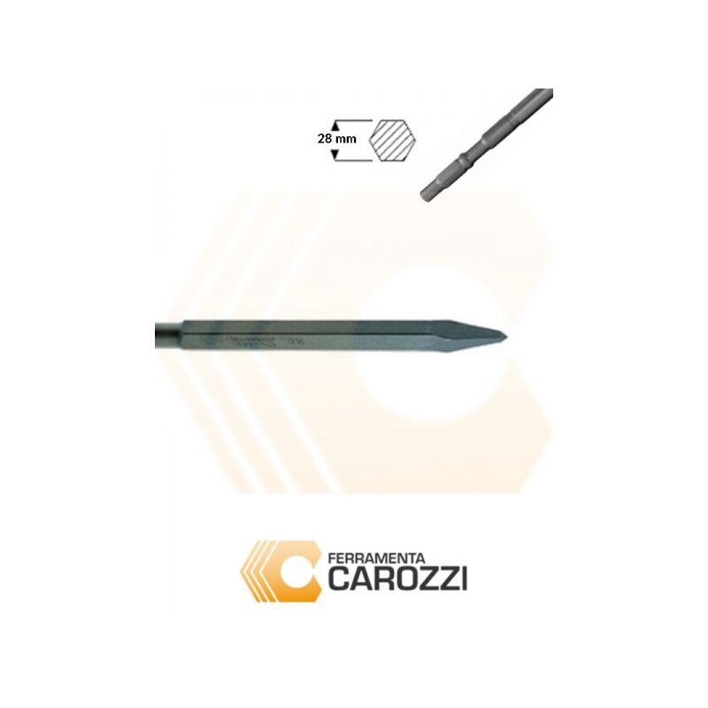 Scalpello a punta attacco esagonale 28 mm per effettuare lavori di demolizione e scalpellatura su calcestruzzo, muri in generale e pietra.ideale disegnato per martello demolitore Makita modelli HM1800 e HM1810L'attacco esagonale da 28 mm di diametro è pensato per grandi demolitori e si adatta perfettamente a sopportare potenze del colpo elevate, fino a 35 J.1 pezzo per confezione Pezzi per confezione: 1