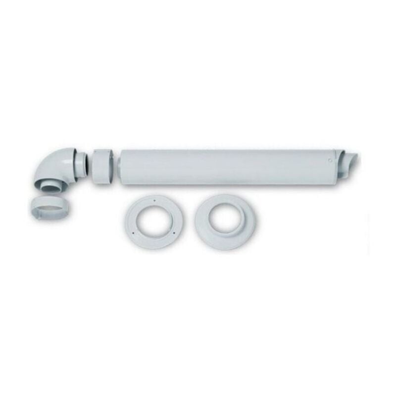 Kit Fumi coassiale in alluminio Ø 60/100 Compatibile per Vaillant, Ariston, Chaffoteaux, Ecoflam, Rheem Radi, Simat. Dotato di manicotto in EPDM completo di fascetta metallica Condotto coassiale Ø60/100 L. 750 completo di terminale ASP/SCAR antivento. Rosoni coprimuro in EPDM bianco.