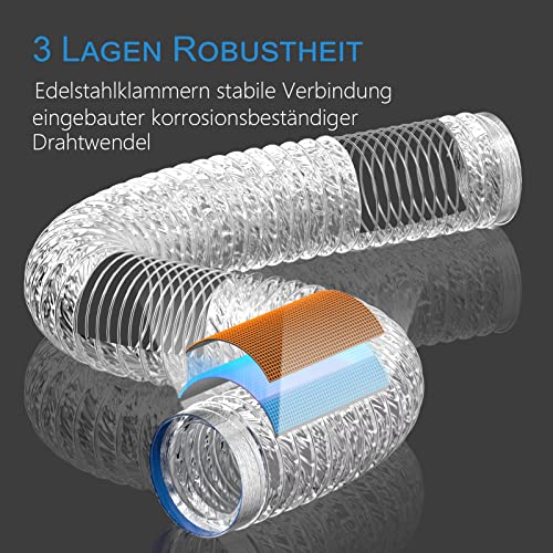 3 strati di robustezza: condotto di ventilazione flessibile realizzato in alluminio ignifugo di alta qualità e bobina metallica integrata resistente alla corrosione per rinforzo e prestazioni durature.