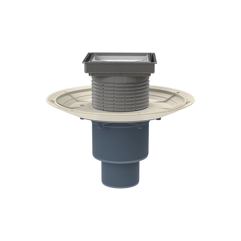 Scarico a pavimento DN50/75/110 verticale, con dispositivo antiodore e portagriglia piastrellabile con cornice inox 132x132mm / 112x112mm, 10 - 80mm accorciabile. Protezione rotonda per il cantiere compresa nella fornitura.
