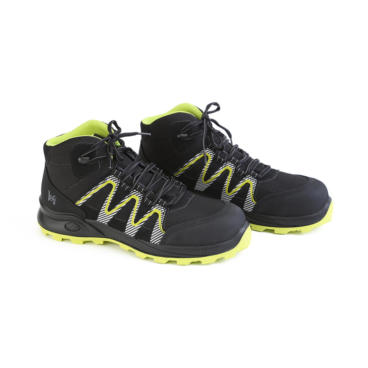 Calzatura da lavoro alta, in tessuto sintetico e pellame nero ricoperto in pu idrorepellente, suola in gomma, puntale in fibra di vetro, lamina tessile non metallica antiperforazione. s3 hro hi src. Impermeabile. 100% metal free