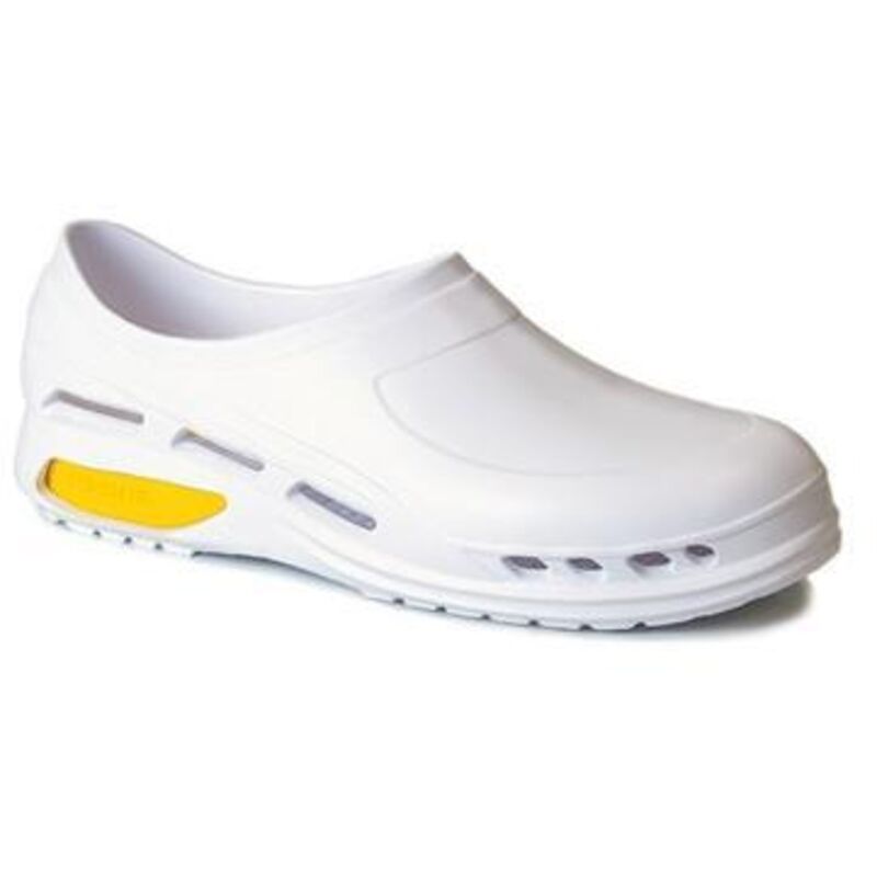 Scarpe protettive conformi ai requisiti delle norme sulle calzature da lavoro EN ISO 20347: A E SRC Caratteristiche: molto leggere: solo 200 g ogni paio, aerate: i fori laterali forniscono aerazione ma al contempo evitano l'ingresso di liquidi, anatomiche: rispettano la naturale anatomia del piede, antishock: ottimo assorbimento di energia nella zona del tallone, antiscivolo: il design della suola risponde ai requisiti SRC relativi alla resistenza allo scivolamento. Altre Caratteristiche: Antistatiche: l'elemento antistatico nella zona del tallone rimane tale anche dopo molti lavaggi, Lavabili fino a 50°C: con detergenti normali neutri, resistenti alla sterilizzazione chimica o UV, Antibatterici, antimuffa, antifunghi, senza lattice. Scatola multilingue: Inglese, Francese, Italiano, Spagnolo, Portoghese, Tedesco, Greco, Arabo.Colore: Bianco, Taglia EU: 41.