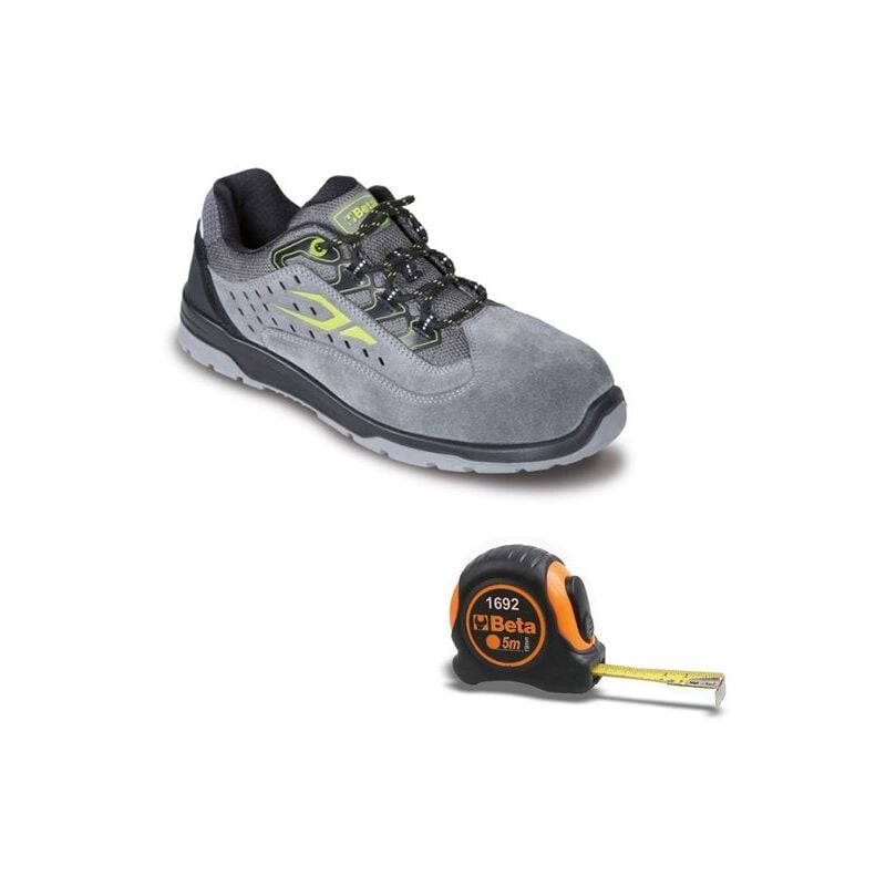 Scarpe antinfortunistiche con tomaia in pelle scamosciata traforata con supporto di stabilità al tallone. Suola in poliuretano bidensità e puntale in materiale polimerico, resistenza 200 Joule. Antiperforazione grazie alla fibra composita con trattamenti ceramici. Sottopiede anatomico con rialzo ammortizzante nella zona del tallone Peso 550 g CLASSE DI PROTEZIONE: S1P SRC NORMATIVA EU: EN ISO 20345:2011 In omaggio: Flessometro compatto Beta 1692 5 metri x 19 mm cassa in ABS antiurto. SCHEDA TECNICA