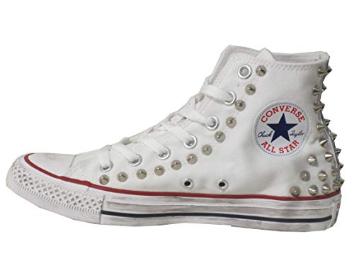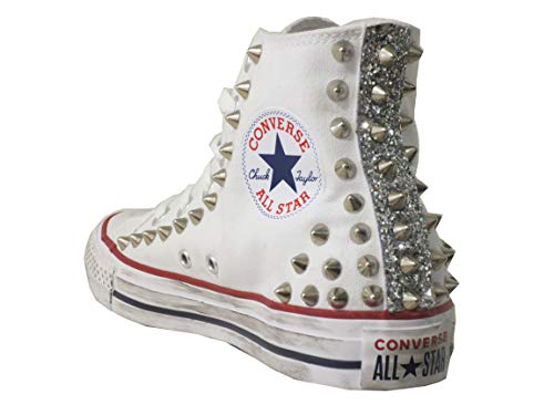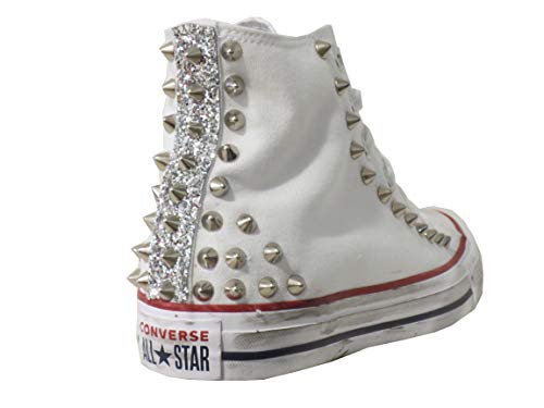 Scarpe Tela Alte Bianche Borchiate con Borchie e Glitter (Bianco, 39)