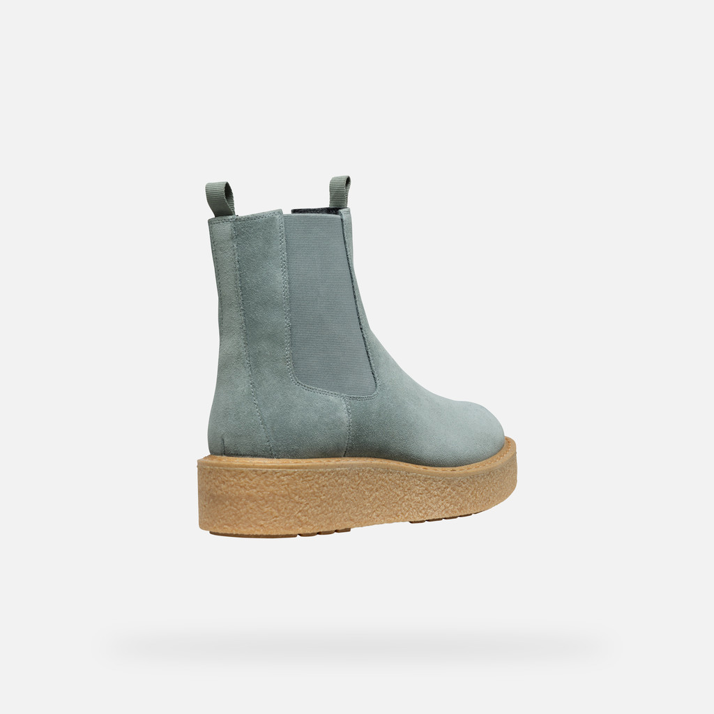 Stivaletto donna con suola flatform, dal dna casual e moderno. Stivaletto donna con suola flatform, dal dna casual e moderno. Realizzato in morbido scamosciato con inserto in elastico ton-sur-ton, è qui proposto in una delicata tonalità e alternativa verde salvia. Confortevole e traspirante, Elidea arricchisce gli abbinamenti informali cittadini e gli outfit del tempo libero.