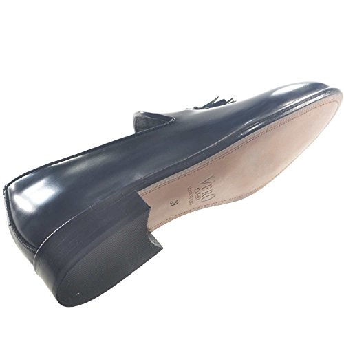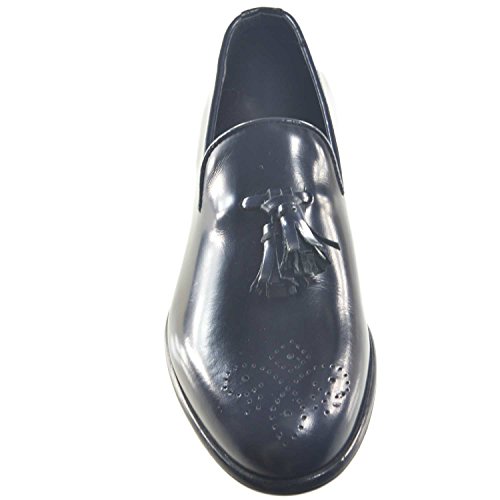 Scarpe Mocassino Uomo Classico Cerimonia Blu Campanelle Bon Bon monogramma Vera Pelle Made in Italy Suola Cuoio (42 EU)