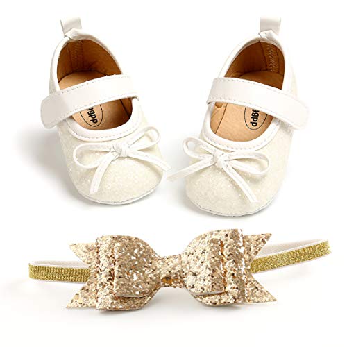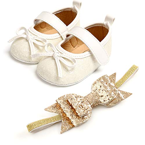 Scarpe Neonata Fiore con Cerchietto Battesimo Set Regalo - Scarpine Primi Passi - Scintillante Bowknot Bambina Anti Scivolo Mary Jane Scarpe per Neonata per la Festa Nuziale Scarpe