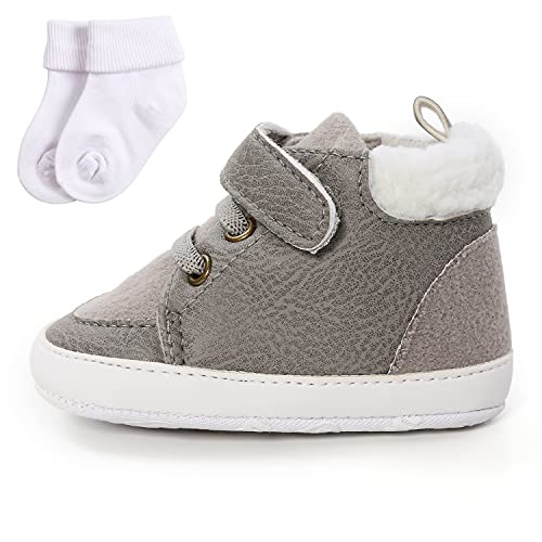 2 Pz Scarpe Primi Passi Infantile Sneaker Bambino Scarpine Neonato Stivali Invernali Neonato Scarpe AntiScivolo Caldo in Pelle + Calzini (grigio+calzini, 0-6 mesi)