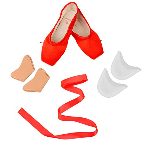 Scarpette da punta per danza classica, da donna, con suola in cuoio e con, separati dalle scarpette, cuscinetti per le dita, in gel di silicone, e nastro, donna Bambino, red, UK4.5 (foot length: 235mm = 9.25 inch)