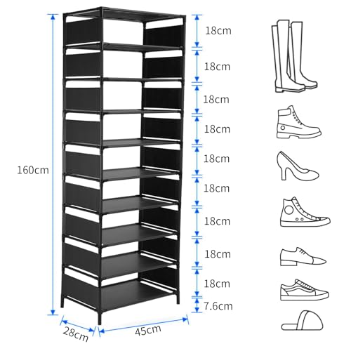 Scarpiera a 10 Ripiani,scarpiera alta e stretta,scarpiera verticale,scarpiera salvaspazio,Organizzatore per Scarpe, 45 x 28 x 160 cm, Telaio in Metallo, Ripiani in Tessuto Non Tessuto, Corridoio