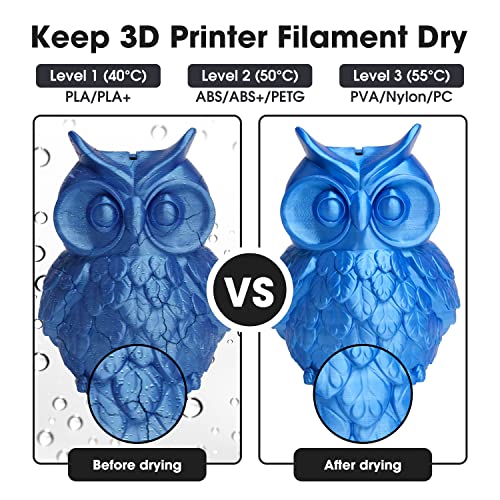 Mantiene il filamento asciutto: eBOX può mantenere il riscaldamento fino alla temperatura preimpostata e continuare a funzionare fino al tempo preimpostato, riscaldamento efficiente entro due ore. Riscaldare più uniformemente, il pezzo riscaldante curvo e il pezzo di conduzione del calore della lamiera sottile rendono più facile mantenere la temperatura costante e l'umidità all'interno della scatola.