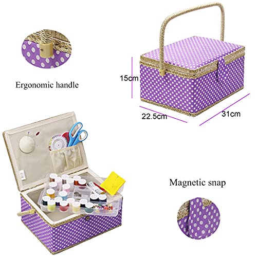 D&D, scatola da cucito con kit da cucito con accessori, cestino organizer in legno con accessori per la casa e per i viaggi, color blu a pois, grande large Purple