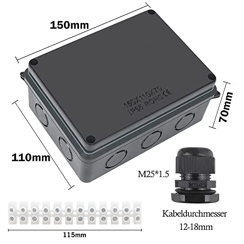 Scatola di derivazione impermeabile IP65, scatola di derivazione M25, scatola di distribuzione elettrica in ABS, scatola di collegamento elettrico esterna, colore nero (150 x 110 x 70 mm)