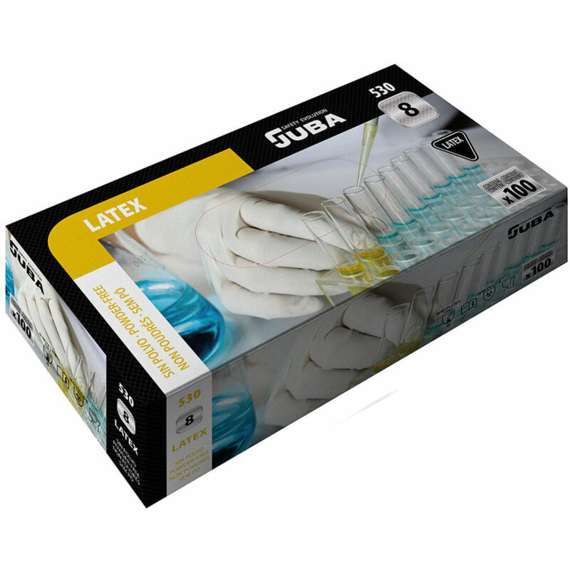 Confezione da 100 guanti monouso in lattice senza polvere juba. misura 7. cat iii, spessore 0,12 mm, certificato per bassi rischi chimici e alimentari, colore naturale, presentato in una scatola dispenser. il lattice garantisce maggiore precisione e sensibilità. eccellente comfort e aderenza alla mano, ambidestro. en374-2:2014.