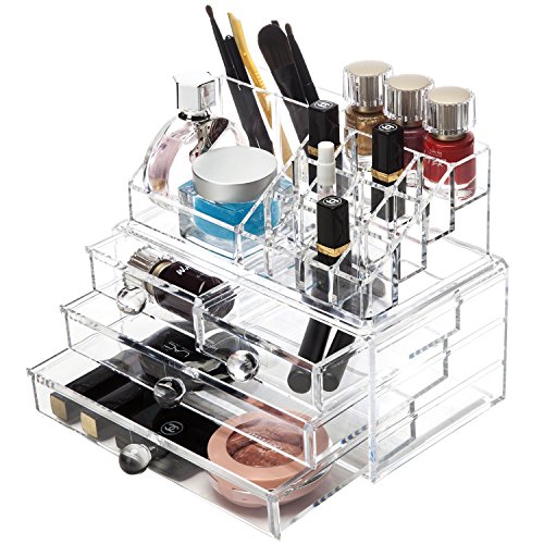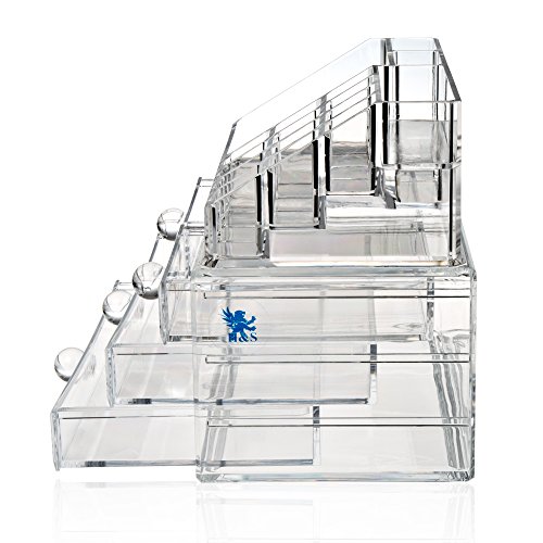 H&S®, scatola organizer per trucchi, 4 cassetti, in acrilico, misura grande, colore: trasparente
