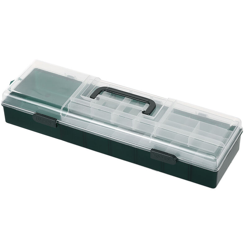 Caratteristiche: Conserva i tuoi effetti personali in ordine e non mancheranno facilmente. Realizzato in materiale plastico leggero, durevole da usare. Il design a doppio strato offre un ampio spazio per i tuoi effetti personali da pesca. Divisori rimovibili per personalizzare i vani portaoggetti. Si adatta ai tuoi diversi accessori, come esche, ganci, ecc. I fermi fissi facilitano l'apertura e la chiusura della scatola. Passante per appenderlo facilmente allo zaino. Il design trasparente consente di trovare e cambiare rapidamente le esche. Specifica: Materiale: plastica Dimensioni: 43 * 12 * 8 cm / 16,9 * 4,7 * 3,1 pollici Peso: ca. 475 g / 16,8 once Elenco dei pacchetti: 1 * scatola da pesca