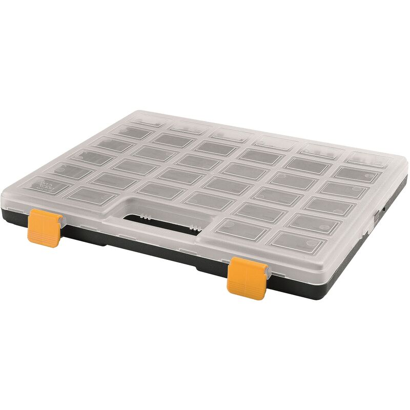 Scatola di plastica trasparente L 372 x p 314 x h 40 mm, con coperchio trasparente La gamma di piccoli strumenti per valigette della serie Valentino offre un'ampia varietà di dimensioni e modelli. Tutti i vassoi sono dotati di copertine trasparenti anti -flocked. Modelli disponibili con separatori e cassetti fissi e rimovibili all'interno. Il design ha un forte impatto visivo. Prodotto con polistirene e polipropilene antichoche, resistenti alle intemperie e resistenti a solventi e oli. Sono fabbricati con riciclaggio e plastica riciclabile, rispettando le normative di portata.