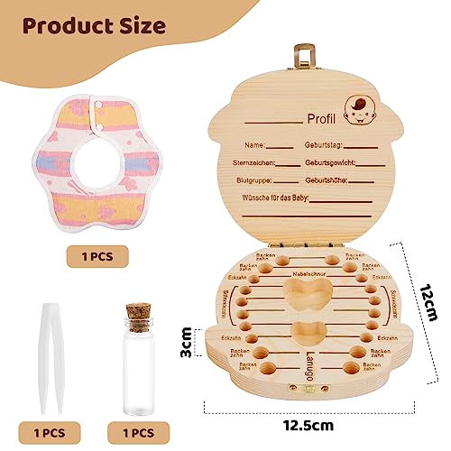 Confezione: 1 scatola per denti da latte in legno, 1 pinzetta, 1 bottiglia, 1 bavaglino. Pinzetta delicata e una bottiglia per conservare il cordone ombelicale e il cordino di lanugo dei neonati, in modo da poter raccogliere questi preziosi ricordi della tua infanzia in modo igienico e pratico.