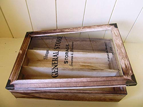 Scatola per posate, in stile rustico shabby chic, con 3 scomparti, coperchio in vetro.