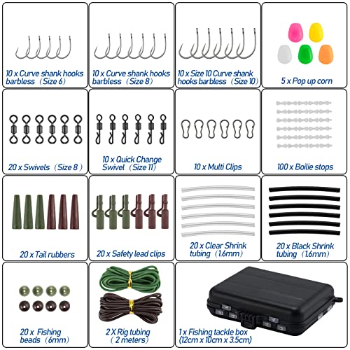 Tutto ciò che serve è incluso: ganci, girelle, gomme posteriori, clip di piombo e coni, perline di impatto, si ferma boilies, ridurre tubo e tubo di perforazione, ecc