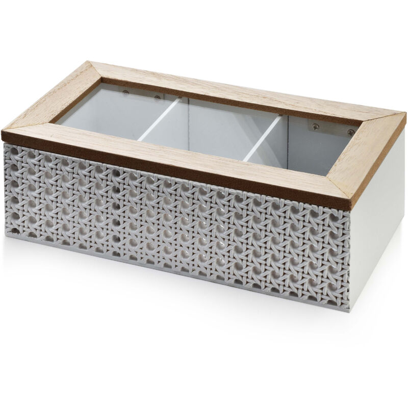 Scatola SADIE della MONDEX dal 1986 per tè con 3 scomparti. I momenti preziosi richiedono la giusta cornice e niente li mette in risalto come il tuo tè preferito servito in modo elegante. Presentiamo una scatola da tè con 3 scomparti. Una parte insostituibile di ogni cucina o soggiorno per gli amanti di questa bevanda aromatica. 3 I pratici scomparti ti consentono di riporre ordinatamente diversi tipi di tè. Grazie a questi scomparti, puoi facilmente organizzare le cose e trovare rapidamente il tuo gusto preferito. Design: l'eleganza classica della superficie in legno rende la scatola non solo pratica ma anche un elemento decorativo. Si adatta a qualsiasi interno e aggiunge carattere. Funzionalità: Il coperchio trasparente consente una rapida visione dell'interno e facilita la scelta del tè giusto senza dover aprire la scatola. Durevole: Realizzato con materiali solidi, garantisce stabilità e longevità proteggendo i tuoi tè dall'umidità e dalla contaminazione. Versatilità: la