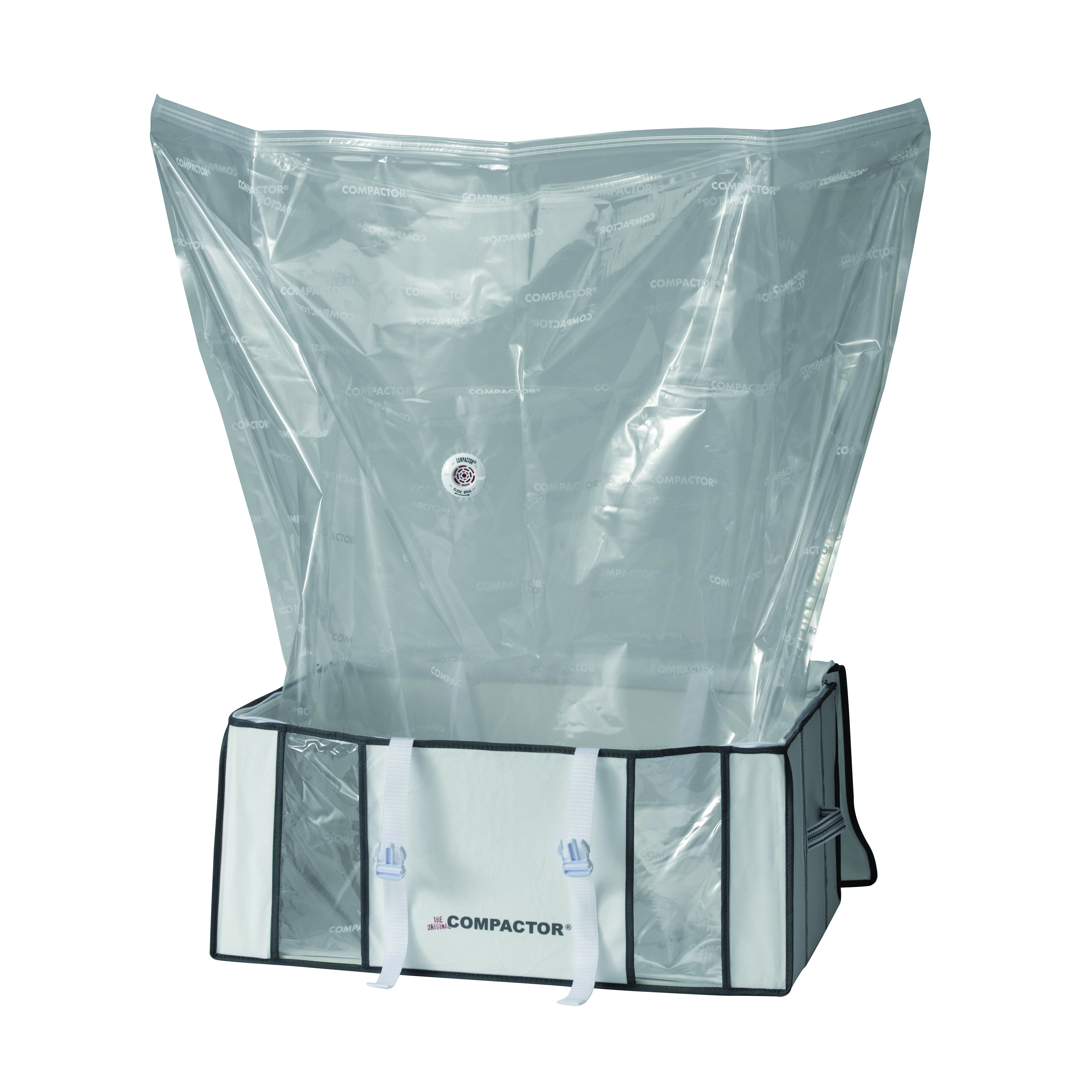 Contiene sacco sottovuoto in plastica color bianco con bottone a pressione. Funzionante con aspirapolvere. Può contenere fino a 210 L. 27x65x50 cm. Ideale per riporre giacche e maglioni. Permette di organizzare meglio lo spazio grazie alla scatola