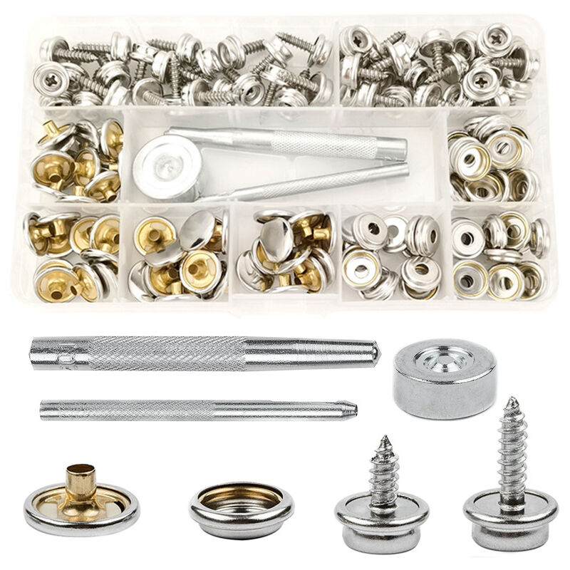 50 set di chiusure a scatto a vite (25 set da 10 mm15 mm ciascuno) + 3 strumenti + scatola di immagazzinaggio