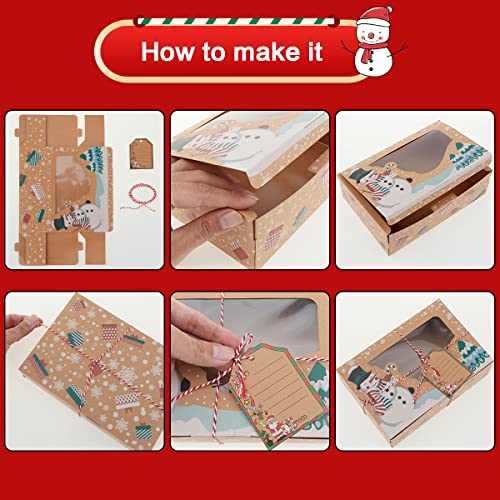 Scatole per biscotti di Natale Kraft AIMMIE Scatole regalo di Natale da12 pezzi con corda colorata ed etichetta, scatola regalo per cupcake con finestra trasparente Confezione per alimenti(22*15*7 cm)