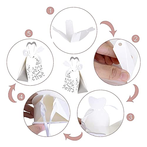 ✿ SPEDIZIONE PIATTA: le scatole per bomboniere devono essere assemblate da soli e l'imballaggio non si danneggia. Lega un fiocco sopra la scatola del vestito da sposa. Puoi scegliere come decorare le tue confezioni regalo per renderlo ancora più speciale.