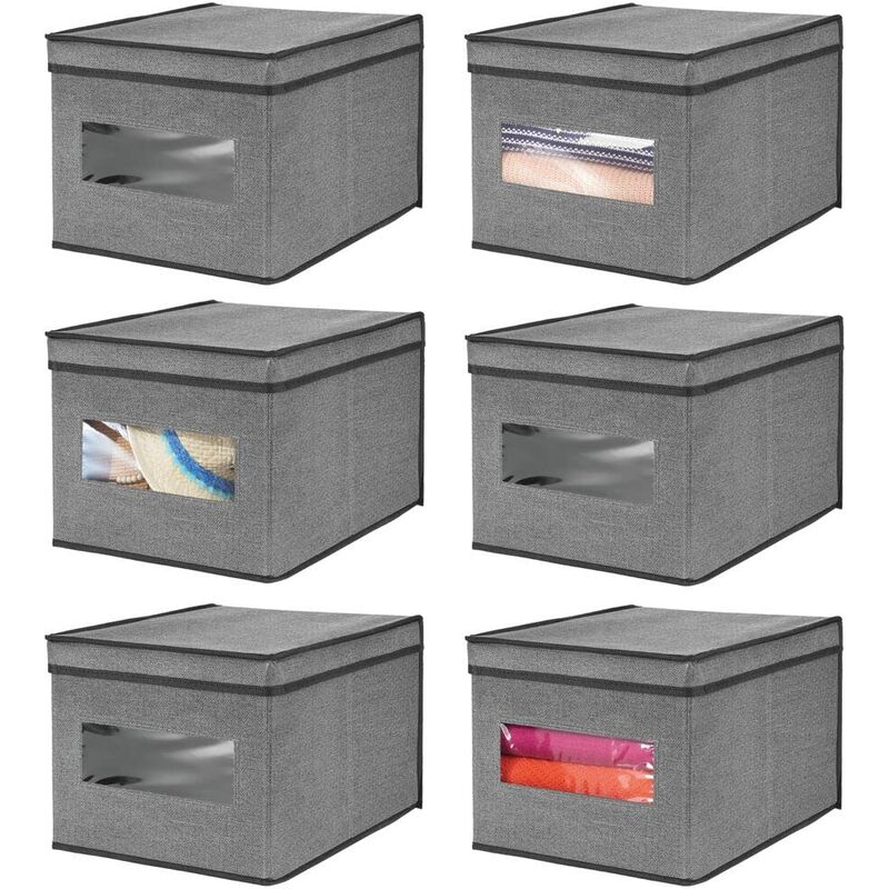 Stanze e armadi ordinati - con la scatola organizer di mDesign in set da 6! Grazie al box contenitore con coperchio di mDesign, mantenere in ordine camere e guardaroba sarà davvero più facile. Queste pratiche scatole sono adatte per vestiti, accessori, scarpe, lenzuola, libri, giocattoli e pupazzi. Adatte in ogni stanza, dalla camera all'ufficio, sono molto utili sia a casa che in camper. Possono essere impilate o poste una vicino all'altra, sia sul pavimento che nel guardaroba oppure su uno scaffale. Questo versatile box è leggero, facilmente trasportabile e all'occorrenza ripiegabile. L'organizer è dotato di un oblò trasparente che permette di riconoscerne immediatamnte il contenuto. Realizzato in tessuto sintetico facilmente ripulibile con un panno umido, è inoltre dotato di bordi e fondo riforzati che conferiscono stabilità e assicurano resistenza nel tempo. Caratteristiche del prodotto nel dettaglio Pratico contenitore per indumenti, accessori e giocattoli Set da 6 Con coperchio