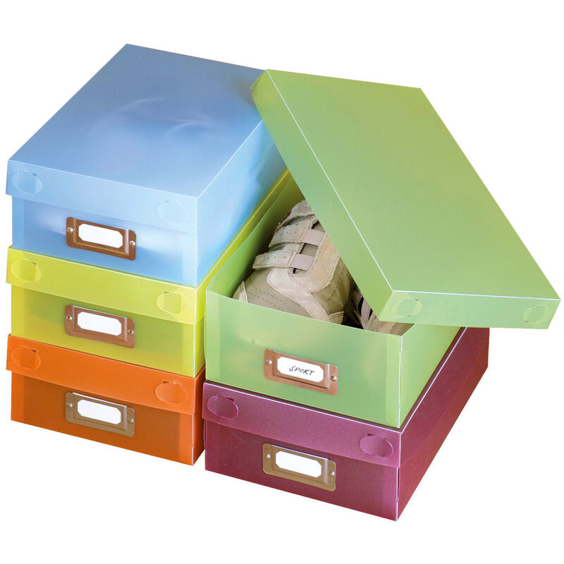 Le scatole Multi dai colori vivaci, in un pratico set da 10 pezzi, tengono tutte le scarpe a portata di mano, in modo decorativo e al riparo dalla polvere. Facili da maneggiare, le scatole si impilano senza ingombrare e portano ordine in ogni armadio e scaffale. Che si tratti di scarpe invernali o estive, tutte le scarpe fino alla taglia 40 sono ordinate nell'armadio, in cantina o in soffitta, fino alla prossima stagione. Grazie all'etichetta, l'utente sa sempre immediatamente cosa contiene la scatola, senza doverla aprire. Quando non viene utilizzata, la scatola si ripiega in dimensioni compatte, rendendola perfettamente adatta per i viaggi e l'uso versatile in tutta la casa. È dotata di un coperchio pratico. Decorative, le scatole per la conservazione sono inoltre perfette per tenere al riparo dalla polvere accessori, giornali, foto, articoli da bagno ecc.