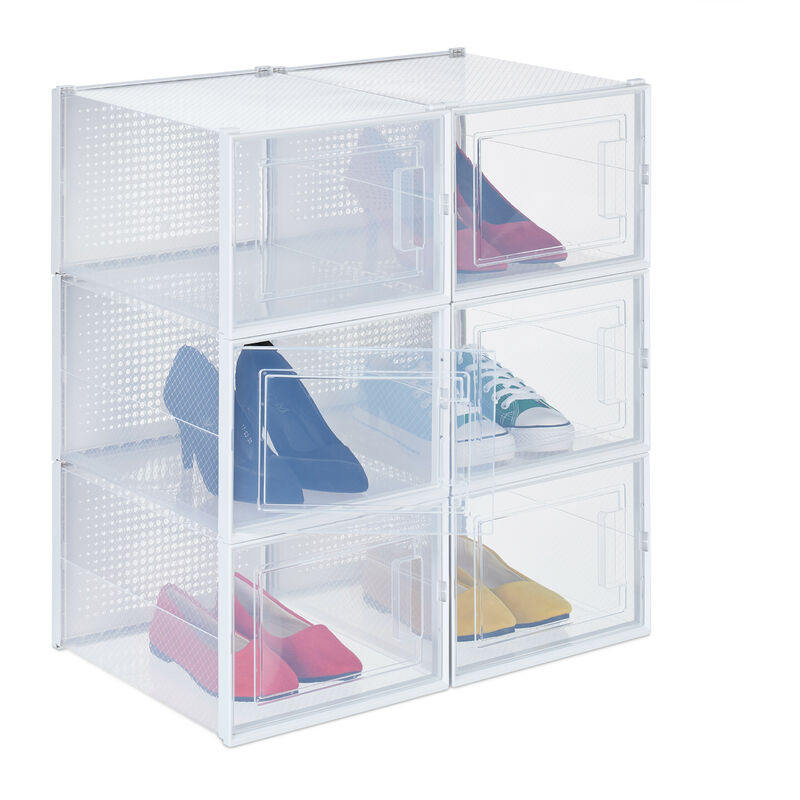Con queste scatole impilabili potrai mettere ordine al caos di scarpe e riporre sneakers, ballerine, sandali e altro ancora in modo chiaro e poco ingombrante. Le scarpe sono facilmente riconoscibili, dato che le scatole sono trasparenti, così da poter scegliere a colpo d'occhio la calzatura giusta per l'outfit del momento. Impila le shoes box di plastica una sull'altra in corridoio o riponil sotto il letto o nell'armadio. Le scatole sono ideali anche per molti altri usi: come contenitori portagiochi, portavestiti, portatrucchi o altro ancora Nota sul montaggio: durante l'assemblaggio, appianare la piega centrale del contenitore su entrambi i lati. In questo modo è più facile incastrare i due coperchi. Set da 6 scatole di plastica per lescarpe in dettaglio - Misure esterne H x L x P: 21 x 28 x 36 cm ca. - Dimensioni interne H x L x P: 19 x 26 x 32 cm ca. - Materiale: plastica PP, plastica ABS - Peso per box: 480 g ca. - Colore: trasparente, bianco Scarpiera modificabile: scatole