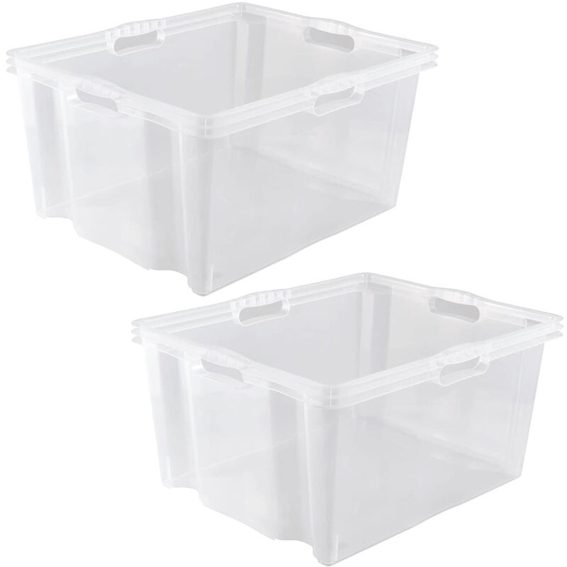 2 x scatola portaoggetti multiuso trasparente con manici integrati, ideale per riporre e ordinare giocattoli, decorazioni, collezioni e altri piccoli oggetti Grande stabilità grazie al bordo rinforzato della cassa, trasporto facile e sicuro grazie a 2 robuste maniglie ergonomiche, facile recupero degli oggetti rimessi grazie alla visibilità da tutti i lati Design moderno senza bordi taglienti, coperchio disponibile separatamente, Impilatura sicura con o senza coperchio grazie al suo sistema di impilamento, può essere impilato all'interno di un altro senza coperchio, facile da pulire con panno umido o spugna Realizzato in Europa, plastica (PP) robusta e di alta qualità, senza BPA e plastificanti, senza emissioni di sostanze nocive Contenuti: 1 Armadietto portaoggetti Franz, Dimensioni XXL, Dimensioni (LxPxA): 52 x 43 x 26 cm, Capacità: 44 l, Trasparente