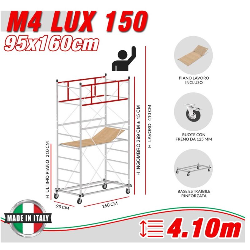 L' acquisto comprende 1 base estraibile UNI EN 1004 160x95 cm (ingombro) 1 campata h 150 cm (2 spalle + 2 correnti + 4 diagonali) 1 parapetto terminale h 120 cm (2 spalle + 4 DIAGONALI + 2 terminali) COLORE ROSSO INDICATIVO 1 piano in betulla con botola 160x64cm 4 ruote girevoli in gomma nera corredate di freno da 125 mm spalle laterali con 5 gradini Il trabattello M4 LUX modello 150 con base estraibile è adatto per usi professionali, edilizia, manutenzioni civili ed industriali, settore elettrico. Facile da montare e smontare, è corredato di ruote da diametro 125 mm. I piani di lavoro sono collegabili ogni 30 cm. I tiranti diagonali sono facilmente applicabili su appositi bussolotti alettati senza alcun uso di viti e bulloni. Il trabattello è zincato elettroliticamente e completo di certificato di conformità. Clicca qui e scopri cos'è la zincatura elettrolitica, come funziona e come protegge i trabattelli in acciaio Principali altezze Altezza ingombro Ultimo piano Lavoro con
