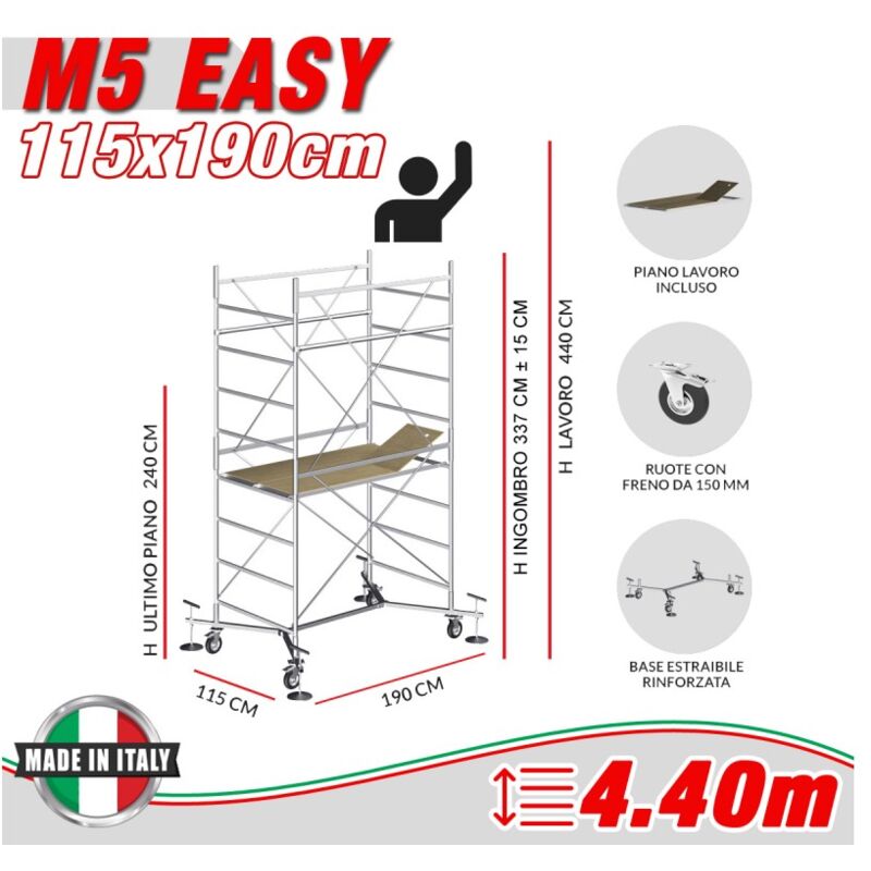 L' acquisto comprende 1 base estraibile rinforzata 190x115 cm (ingombro) 4 livellatori a vite 2 campate h 150 cm (4 spalle + 4 correnti + 8 diagonali) 2 barre di protezione collegabili a qualunque altezza 1 piano in betulla fisso con telaio in acciaio zincato (190x45 cm) 1 piano in betulla con botola e telaio in acciaio zincato (190x45 cm) 4 ruote girevoli in gomma nera corredate di freno da 150 mm Il trabattello M5 EASY è adatto per usi professionali, edilizia, manutenzioni civili ed industriali, settore elettrico. Facile da montare e smontare, è dotato di una speciale base estraibile rinforzata in tre pezzi ed è corredato di ruote da diametro 150 mm. Il piano di lavoro in legno è raggiungibile dall'interno attraverso una botola di passaggio. I tiranti diagonali sono facilmente applicabili su appositi bussolotti alettati senza alcun uso di viti e bulloni. Il trabattello è zincato elettroliticamente e completo di certificato di conformità. Clicca qui e scopri cos'è la zincatura