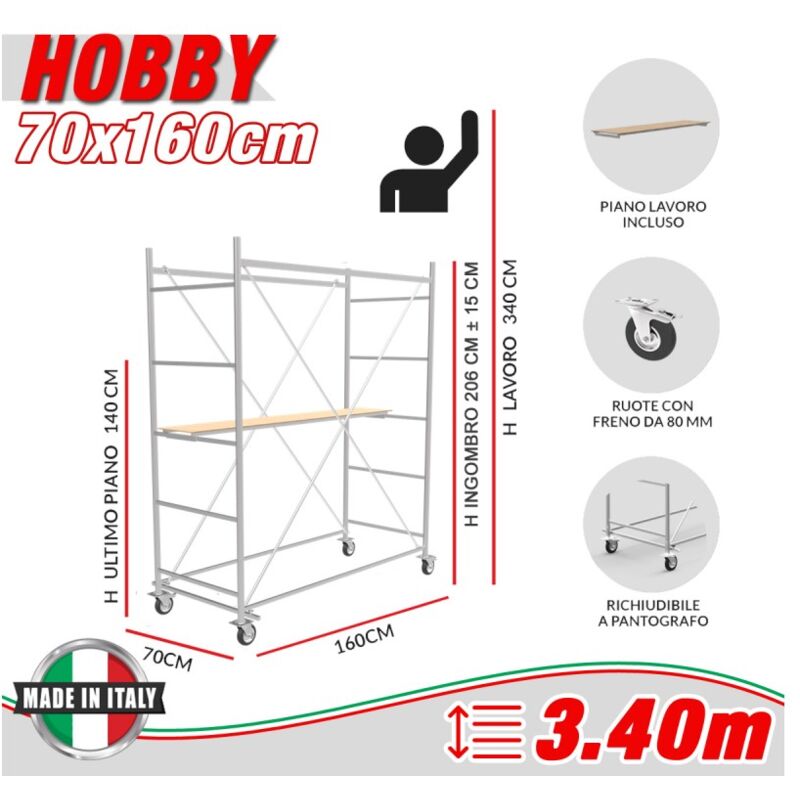 L' acquisto comprende 1 base 160x70 cm (ingombro) 1 campata h 180 cm (2 spalle + 2 correnti + 4 diagonali) 1 semipiano in betulla (160x29 cm) 4 ruote girevoli in gomma nera corredate di freno da 80 mm Per l'utilizzo hobbistico e per il fai da te. Trabattello in acciaio zincato elettrolitico. Facilissimo da montare e smontare. Smontando l'asta laterale può passare attraverso porte e corridoi. Maneggevole grazie alle sue campate da 180 cm. Poco ingombrante, leggero e sicuro. Corredato di 4 ruote diametro 80 mm. Clicca qui e scopri cos'è la zincatura elettrolitica, come funziona e come protegge i trabattelli in acciaio Principali altezze Altezza ingombro Ultimo piano Lavoro con operatore 2,20 m 1,40 m 3,40 m Sfilando l'apposita asta alla base, è possibile richiudere il trabattello perché occupi il minimo spazio e per farlo passare agevolmente attraverso porte e corridoi (immagini indicative delle funzionalità)