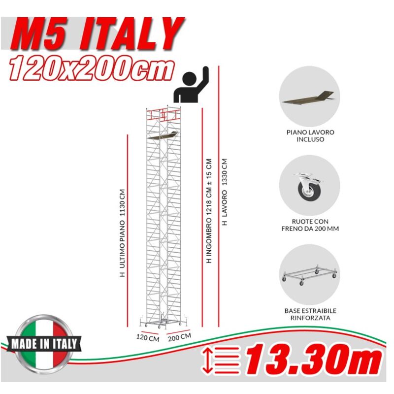 L' acquisto comprende 1 base estraibile rinforzata 200x120 cm (ingombro) 4 livellatori professionali estraibili a vite trapezoidale 7 campate h 150 cm (14 spalle + 14 correnti + 28 diagonali) 1 parapetto terminale h 150 cm (2 spalle + 4 DIAGONALI + 2 terminali) COLORE ROSSO INDICATIVO 1 piano in betulla fisso con telaio in acciaio zincato (200x45 cm) 1 piano in betulla con botola e telaio in acciaio zincato (200x45 cm) 4 ruote girevoli in gomma nera corredate di freno da 200 mm Il trabattello M5 ITALY è adatto per usi professionali, edilizia, manutenzioni civili ed industriali, settore elettrico. Facile da montare e smontare, è dotato di una base estraibile rinforzata in quattro pezzi ed è corredato di ruote da diametro 200 mm. Il piano di lavoro in legno è raggiungibile dall'interno attraverso una botola di passaggio. I piani di lavoro sono collegabili ogni 30 cm. I tiranti diagonali sono facilmente applicabili su appositi bussolotti alettati senza alcun uso di viti e bulloni. Il