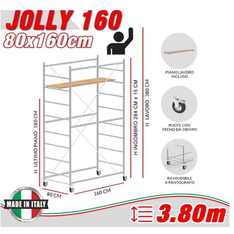 L' acquisto comprende 1 base 160x80 cm (ingombro) 2 campate h 120 cm (4 spalle + 4 correnti + 4 diagonali) 1 semipiano in betulla (160x30 cm) 4 ruote girevoli in gomma nera corredate di freno da 100 mm Per l'utilizzo semiprofessionale e per il fai da te. Trabattello in acciaio zincato elettrolitico. Facilissimo da montare e smontare. Smontando l'asta laterale può passare attraverso porte e corridoi. Maneggevole grazie alle sue campate da 120 cm. Poco ingombrante, leggero e sicuro. Corredato di 4 ruote diametro 100 mm. I piani di lavoro sono collocabili ogni 30 cm. I tiranti diagonali sono facilmente applicabili su appositi bussolotti alettati senza alcun uso di viti e bulloni. Clicca qui e scopri cos'è la zincatura elettrolitica, come funziona e come protegge i trabattelli in acciaio Principali altezze Altezza ingombro Ultimo piano Lavoro con operatore 2,70 m 1,80 m 3,80 m Sfilando l'apposita asta alla base, è possibile richiudere il trabattello perché occupi il minimo spazio e per