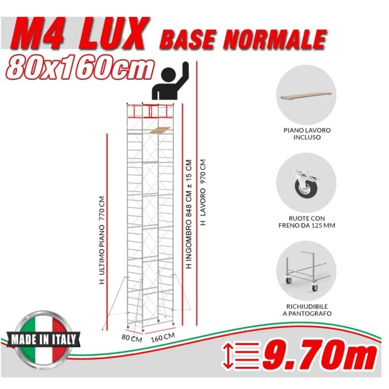 L' acquisto comprende 1 base normale 160x80 cm (ingombro) 4 staffe stabilizzatrici UNI EN 1004 da 180 cm 6 campate h 120 cm (12 spalle + 12 correnti + 24 diagonali) 1 parapetto terminale h 120 cm (2 spalle + 4 DIAGONALI + 2 terminali) COLORE ROSSO INDICATIVO 1 piano in betulla con botola e telaio in acciaio zincato (160x64 cm) 4 ruote girevoli in gomma nera corredate di freno da 125 mm Il trabattello M4 LUX con base normale è adatto per usi professionali, edilizia, manutenzioni civili ed industriali, settore elettrico. Facile da montare e smontare, è corredato di ruote da diametro 125 mm. Il piano di lavoro in legno è raggiungibile dall'interno attraverso una botola di passaggio. I piani di lavoro sono collegabili ogni 30 cm. I tiranti diagonali sono facilmente applicabili su appositi bussolotti alettati senza alcun uso di viti e bulloni. Il trabattello è zincato elettroliticamente e completo di certificato di conformità. Clicca qui e scopri cos'è la zincatura elettrolitica, come