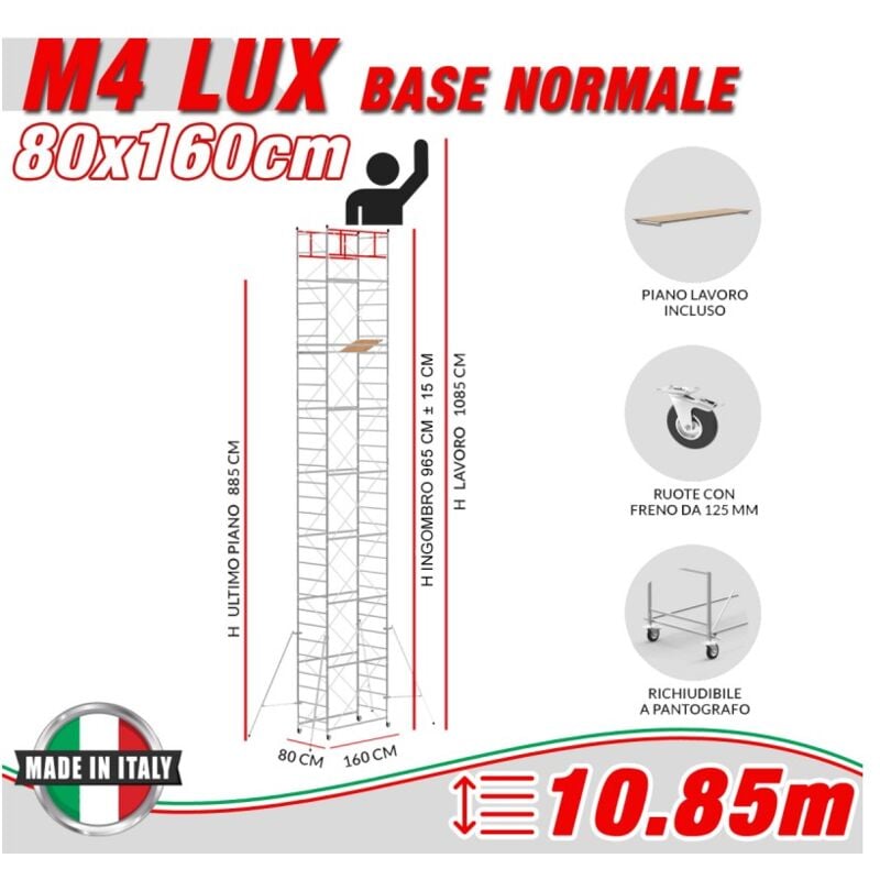 L' acquisto comprende 1 base normale 160x80 cm (ingombro) 4 staffe stabilizzatrici UNI EN 1004 da 180 cm 7 campate h 120 cm (14 spalle + 14 correnti + 28 diagonali) 1 parapetto terminale h 120 cm (2 spalle + 4 DIAGONALI + 2 terminali) COLORE ROSSO INDICATIVO 1 piano in betulla con botola e telaio in acciaio zincato (160x64 cm) 4 ruote girevoli in gomma nera corredate di freno da 125 mm Il trabattello M4 LUX con base normale è adatto per usi professionali, edilizia, manutenzioni civili ed industriali, settore elettrico. Facile da montare e smontare, è corredato di ruote da diametro 125 mm. Il piano di lavoro in legno è raggiungibile dall'interno attraverso una botola di passaggio. I piani di lavoro sono collegabili ogni 30 cm. I tiranti diagonali sono facilmente applicabili su appositi bussolotti alettati senza alcun uso di viti e bulloni. Il trabattello è zincato elettroliticamente e completo di certificato di conformità. Clicca qui e scopri cos'è la zincatura elettrolitica, come