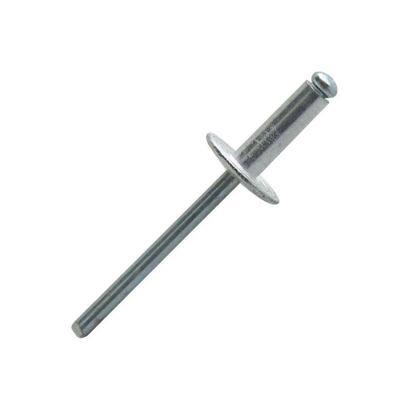 Dettagli: Il rivetto cieco standard è un rivetto costituito da un corpo del rivetto e da un perno di trazione convenzionale. Il punto di rottura sul gambo si trova direttamente sotto la testa, in modo da ottenere un corpo del rivetto vuoto quando è incastrato. Rivetto standard Alluminio / acciaio Testa extra larga